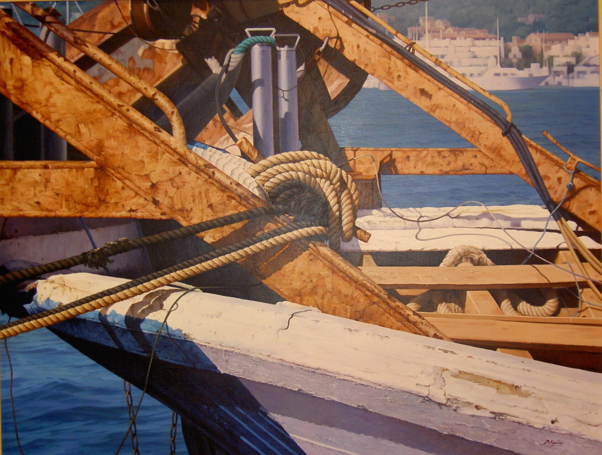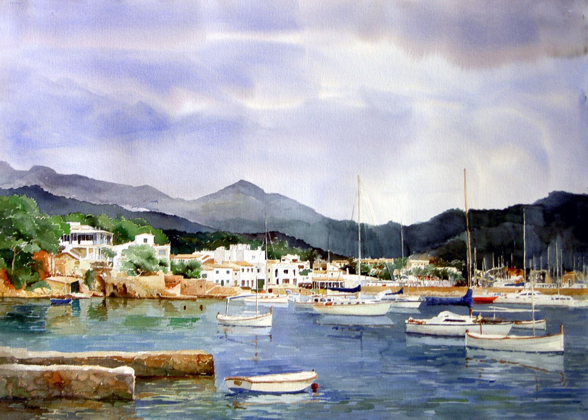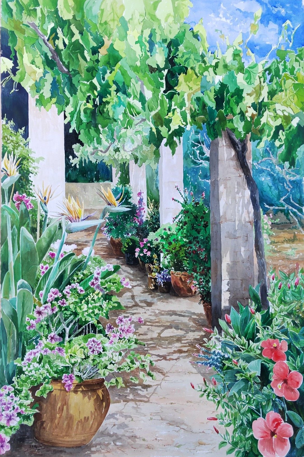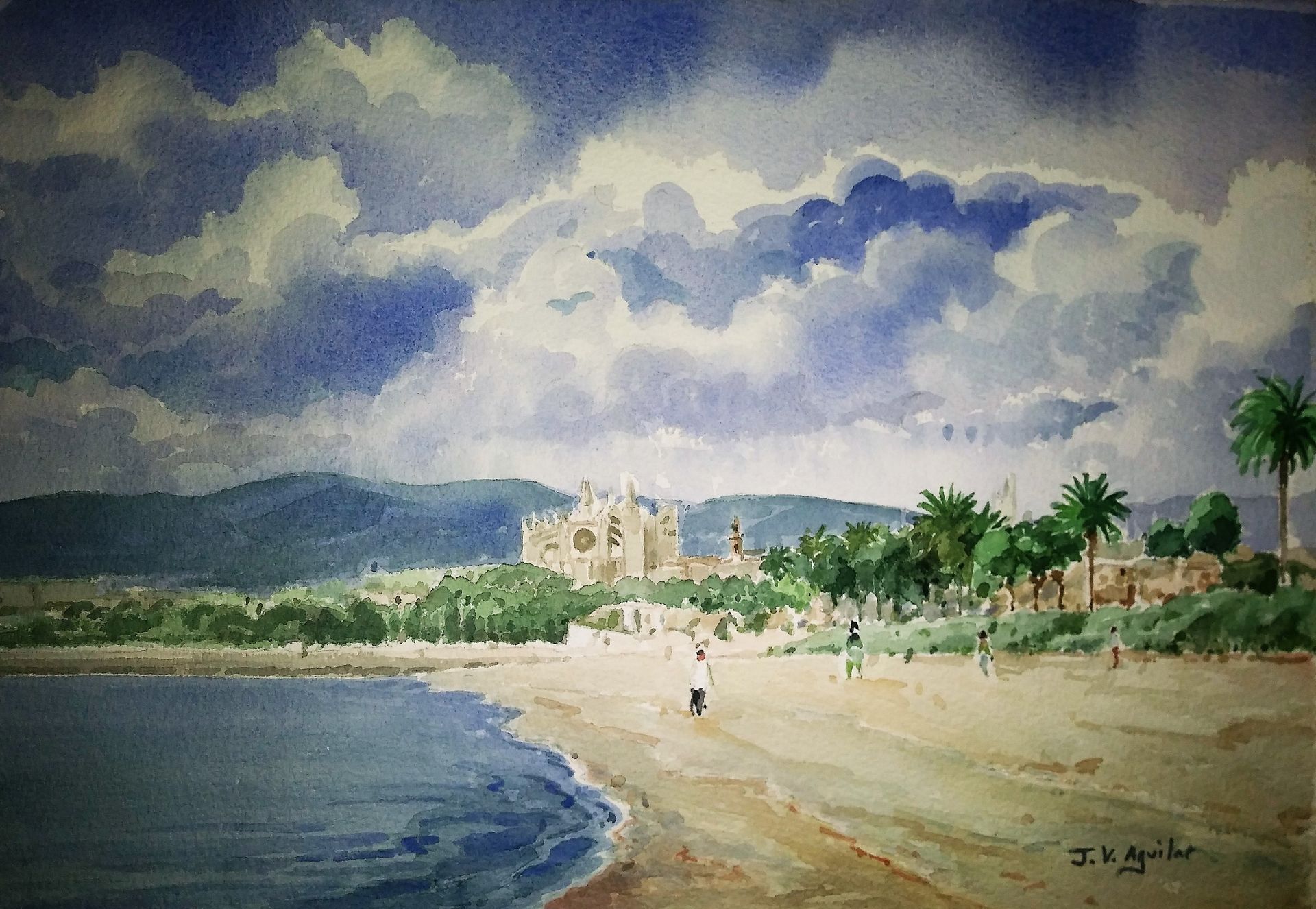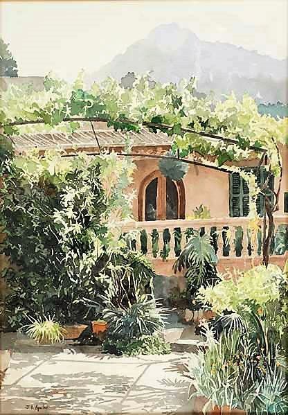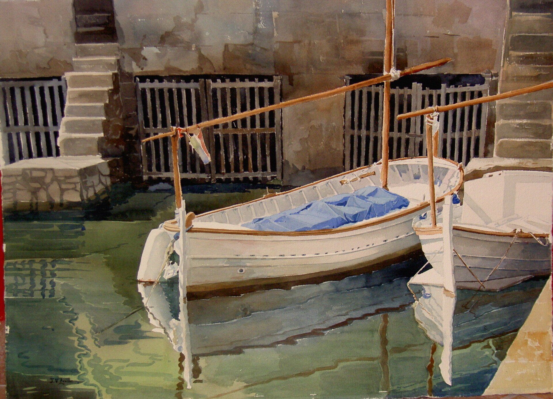 .Juan V. Aguilar Caballero cultiva con indudable maestría la acuarela. Sus aguadas, cuidadas y atentas al detalle, descriptivas, responden a una realización pausada y serena. Le place captar rincones de jardines de gran complejidad descriptiva, espacios llenos de luz balear, atrayentes y fiel reflejo de un dominio no frecuente de la siempre difícil técnica de la acuarela.