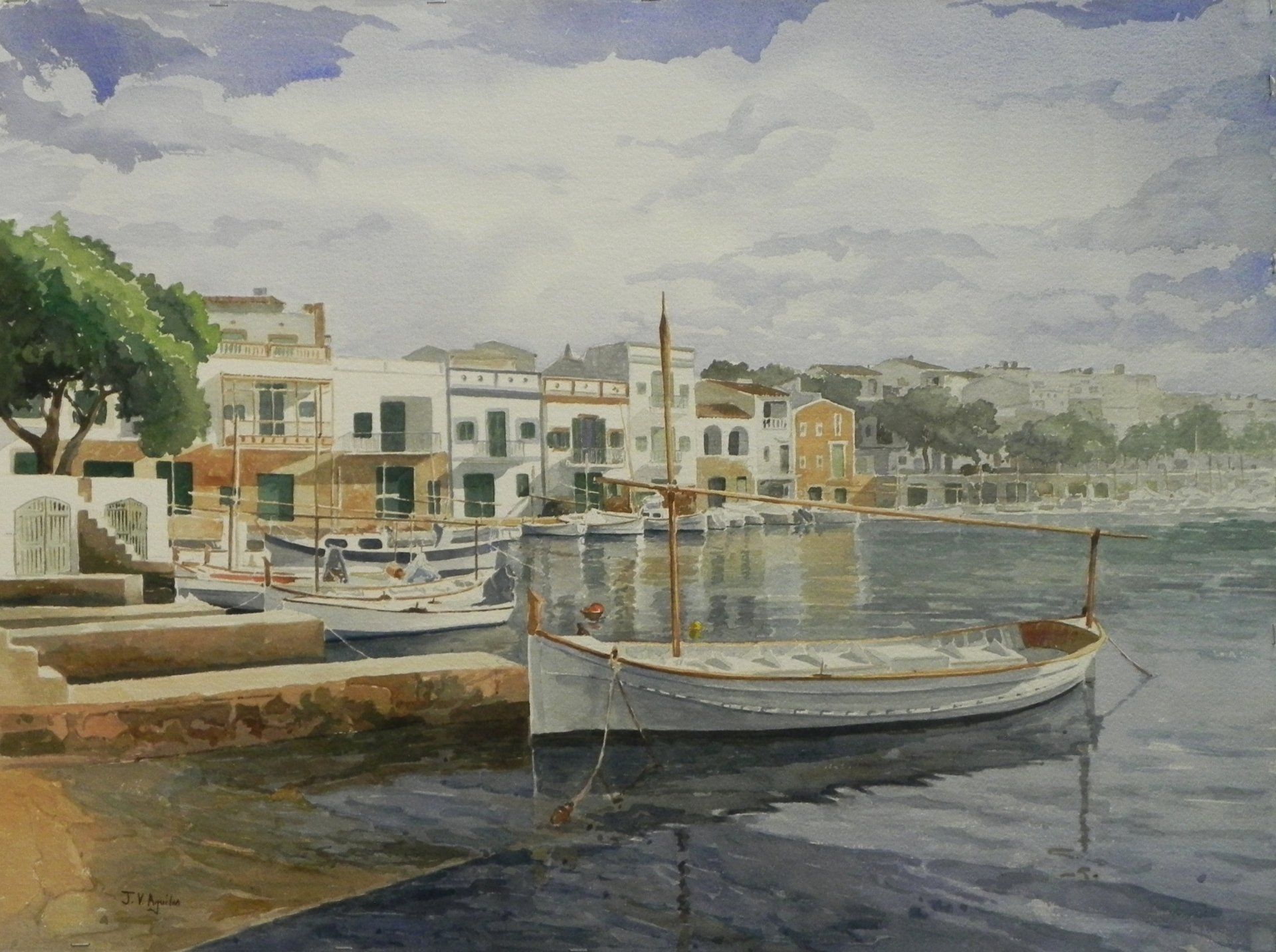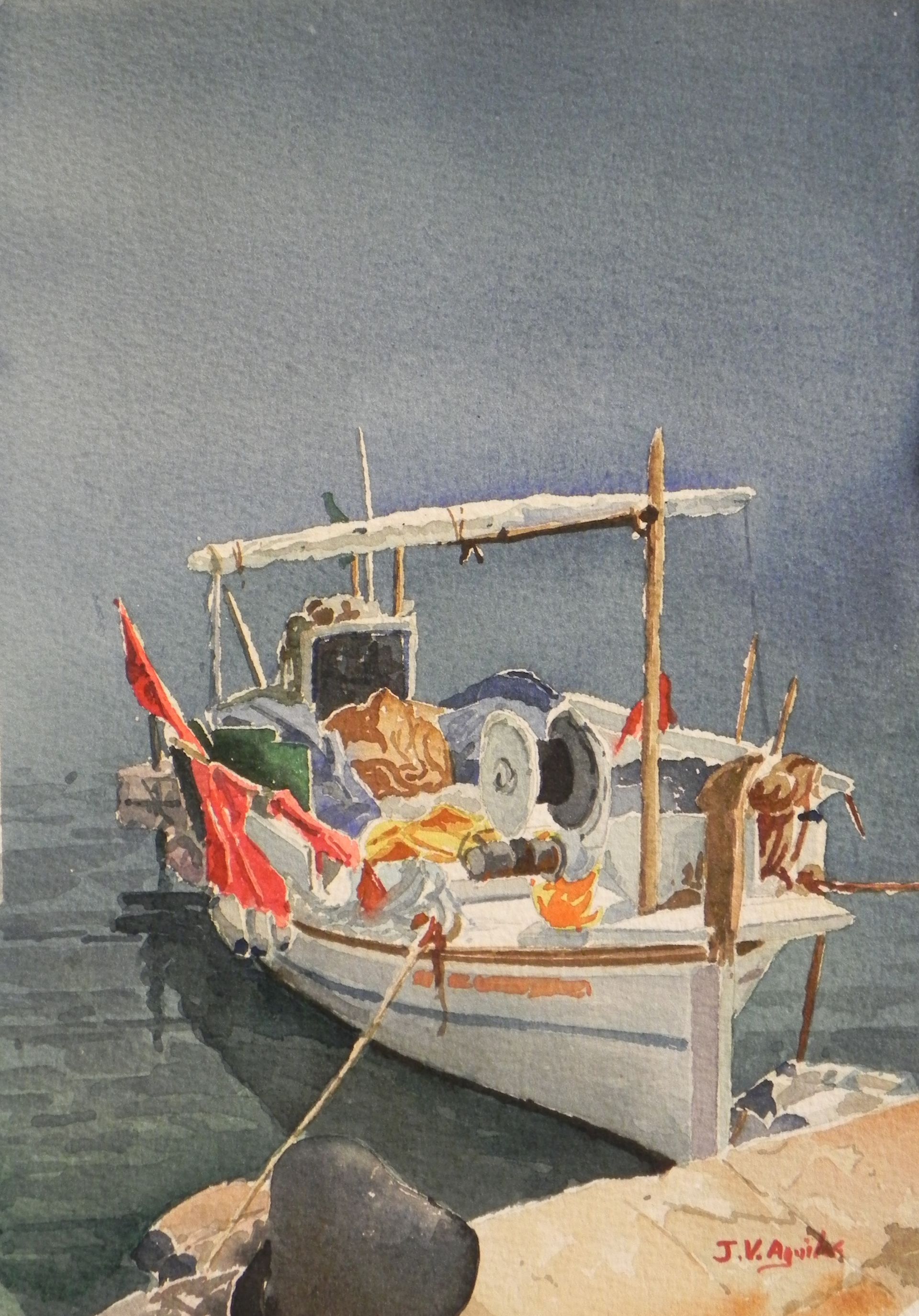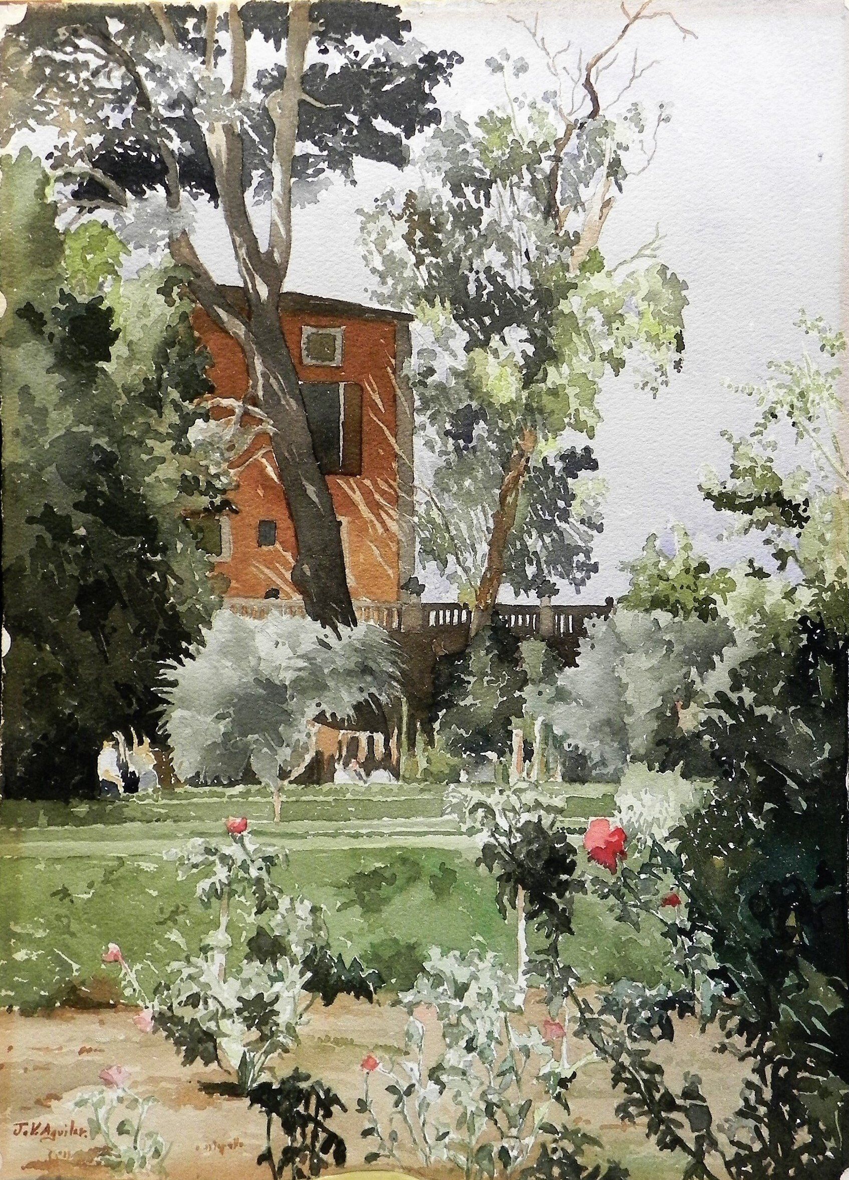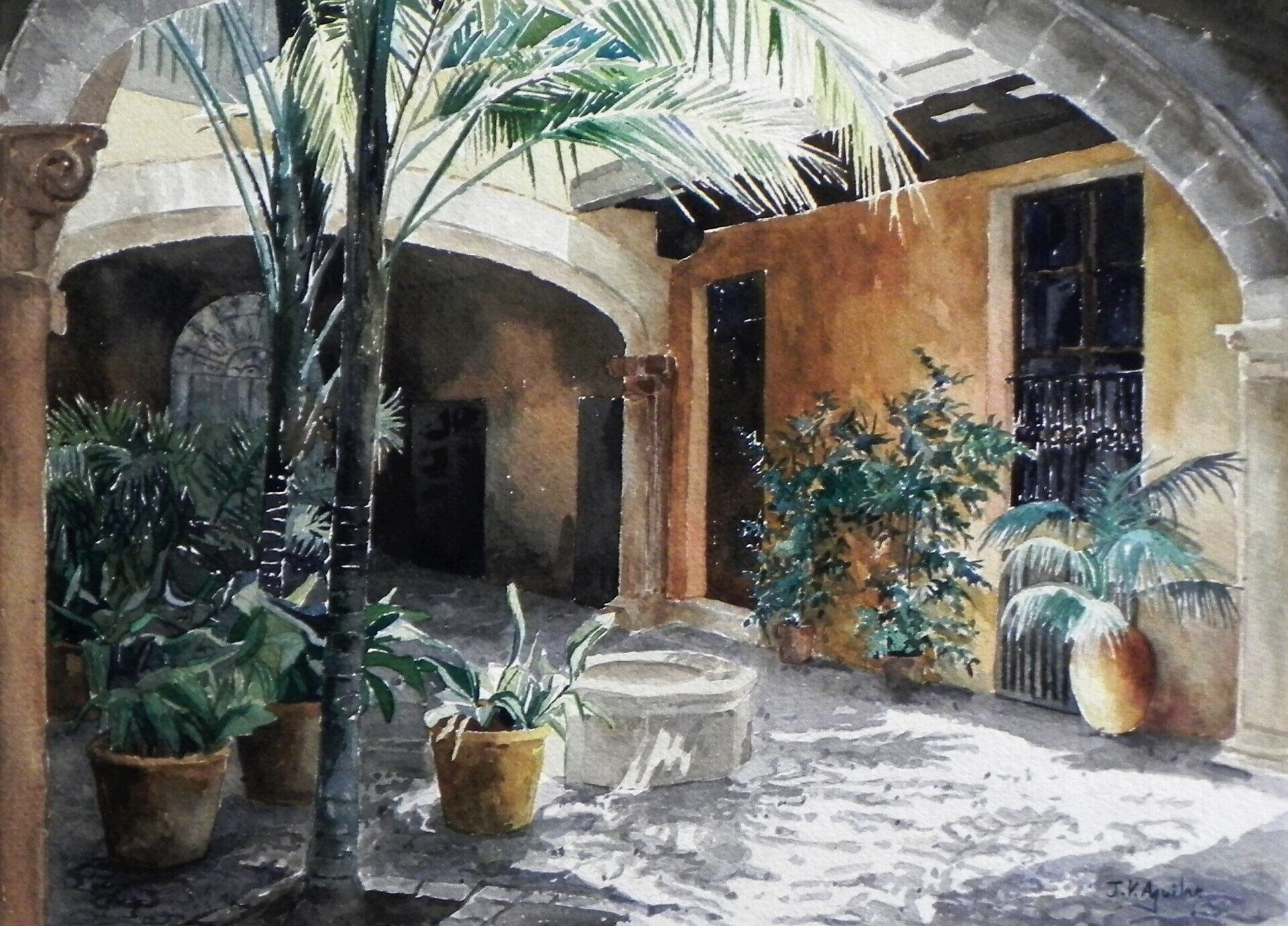 .Juan V. Aguilar Caballero cultiva con indudable maestría la acuarela. Sus aguadas, cuidadas y atentas al detalle, descriptivas, responden a una realización pausada y serena. Le place captar rincones de jardines de gran complejidad descriptiva, espacios llenos de luz balear, atrayentes y fiel reflejo de un dominio no frecuente de la siempre difícil técnica de la acuarela.
